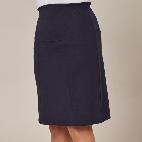 Underbar mjuk och bekväm knälång kjol i marin färg med en bred resårmidja. Längd i storl. M: 58 cm. Fintvätt 40o. 80 % viskos, 15 % polyester, 5 % elastan.